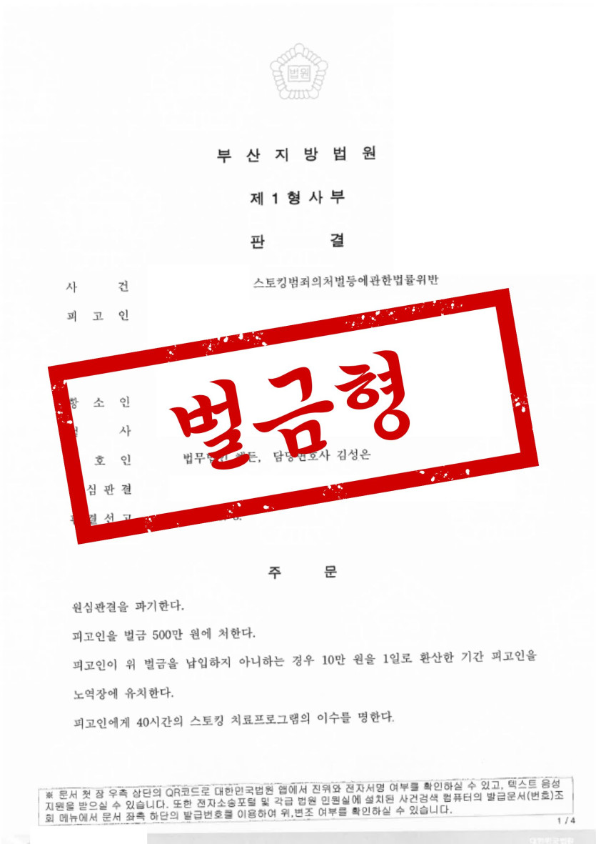 [형사전문변호사] 직장 동료 스토킹 사건, 1심 징역형 집행유예 → 항소심 벌금형으로 감형된 사례