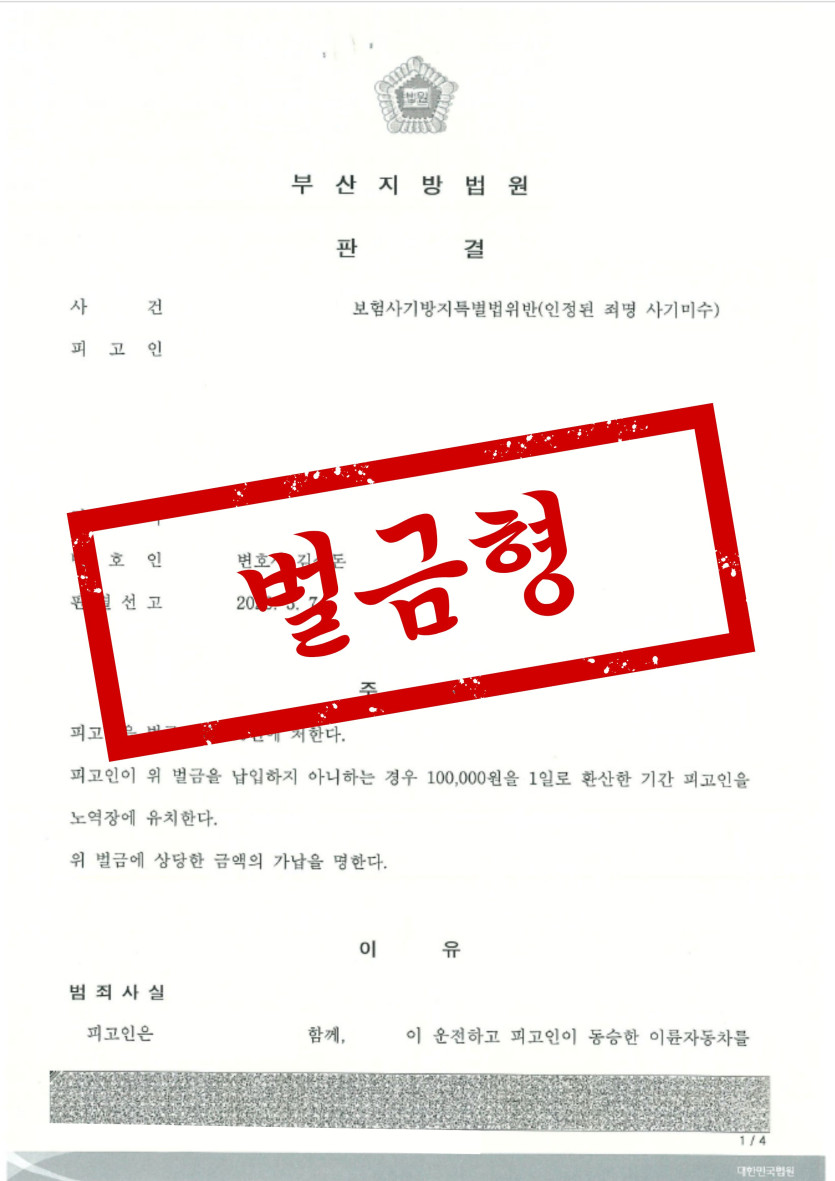 그 결과 의뢰인은 보험사기 실형이나 집행유예가 아닌 적은 금액인 50만 원의 벌금형으로 사건을 마무리 할 수 있었습니다.