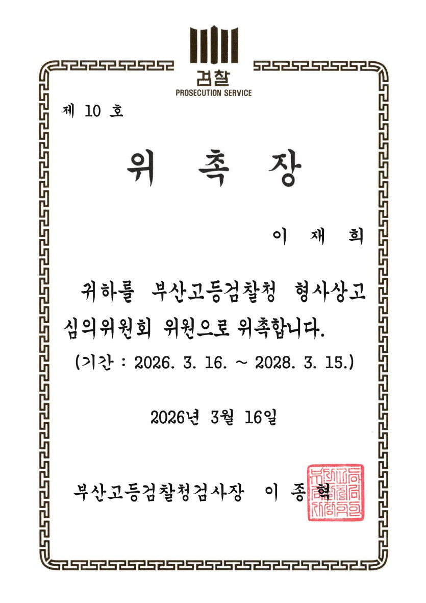 2026년 3월 16일 법무법인 해든의 이재희 변호사가 부산고등검찰청 형사상고심의위원회 위원으로 위촉됐다.