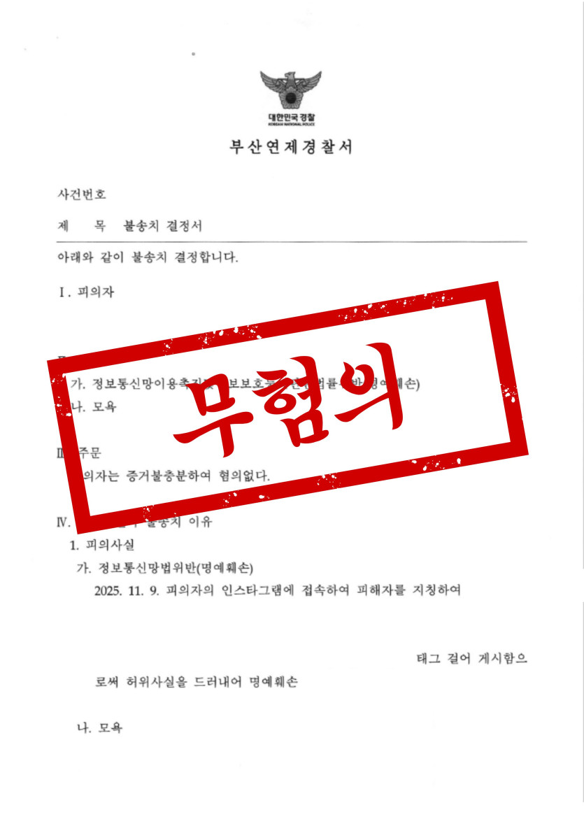 - 정보통신망이용촉진및정보보호등에관한법률위반(명예훼손), 모욕죄, 피의자는 증거불충분하여 혐의없음(불송치)